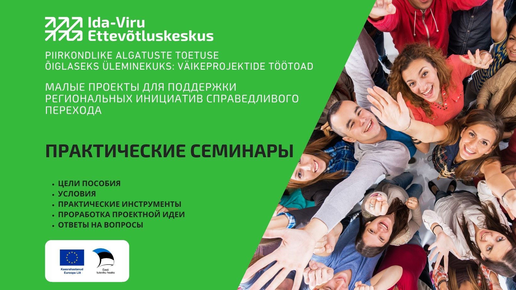 Центр Предпринимательства Ида-Виру приглашает на практические семинары по малым проектам для поддержки региональных инициатив справедливого перехода, которые будут проходить во всех местных самоуправлениях уезда на эстонском и русском языках в период с марта по май 2024 года.